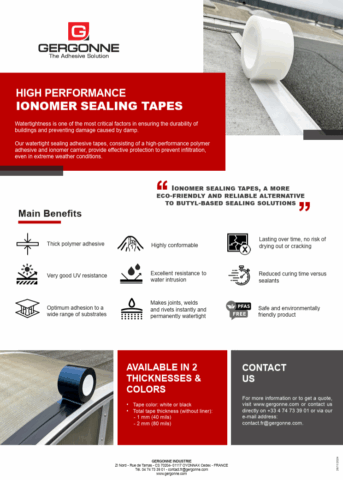Les rubans adhésifs ionomères d’étanchéité à l’eau GERGONNE, composés d’un adhésif polymère haute performance et d’un support ionomère, offrent une protection efficace contre les infiltrations, même lors de conditions météorologiques extrêmes.