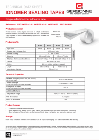 - Ruban adhésif ionomère d’étanchéité à l’eau haute performance